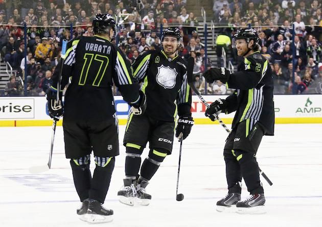 COLUMBUS, OH - JANUARY 25: Radim Vrbata #17 of the Vancouver Canucks and Team Foligno celebrates with Drew Doughty #8 of the Los Angeles Kings after scoring a goal in the first period against Roberto Luongo #1 of the Florida Panthers and Team Toews during the 2015 Honda NHL All-Star Game at Nationwide Arena on January 25, 2015 in Columbus, Ohio. (Photo by Bruce Bennett/Getty Images)